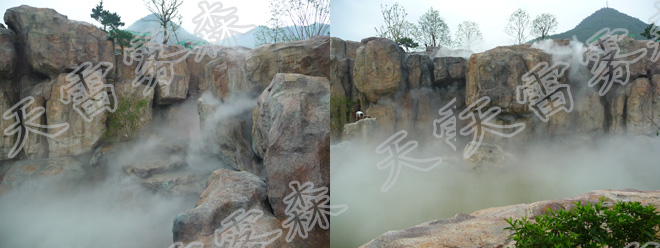 人造霧設備采用先進科技設備,將普通的水經過過濾系統的處理,確保整個系統在最佳條件下順利運轉,經過高壓機組加壓后,完成系統傳輸,經由霧噴噴頭,使水形成1-15微米的自然顆粒,霧化至整個空間,這些微小的人造霧噴顆粒能長時間漂浮、懸浮在空氣中。人造霧噴景觀系統可產生一種新奇獨特的景觀效果,且參與性非常高。