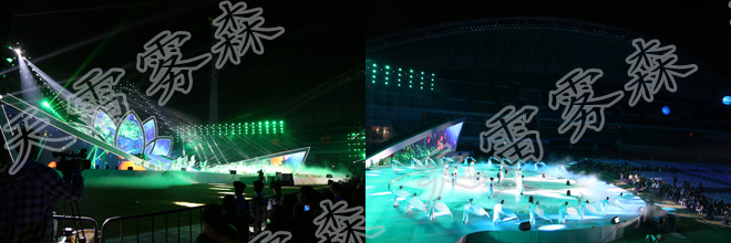 現在大型活動開幕式一般都在室外廣場或室內體育館內舉行,場地大,若沒有較強的舞美表現手段,觀眾不容易集中視線注意到舞臺上在表現什么。那么,運用天雷噴霧系統,能夠在大面積舞臺上集聚性地、快速地出現大面積霧效,使整個氛圍的烘托成為一件易實現和控制的效果。燈光在大場景里也是非常重要的載體。霧與燈光結合,特別是與染色燈的結合作用,把全場的顏色渲染開來,形成豐富的色海,帶給了觀眾極富沖擊力的視覺享受。