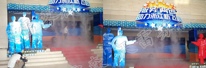 目前有一種新型的噴霧系統不但克服了傳統噴霧機的缺點,可以多次使用,霧量、噴霧時間和持續時間都可以隨心所欲地控制,而且霧效美觀又有益身心健康,它是利用市政供水,經過水處理程序進行粗濾、精濾,將水質中的雜質及鈣鎂離子分離,由反沖裝置將其排出,高壓系統對被過濾的水源進行加壓,使其變成汽液兩態的混合物,通過寶石噴頭噴出,溶入空氣中,形成自然霧氣。