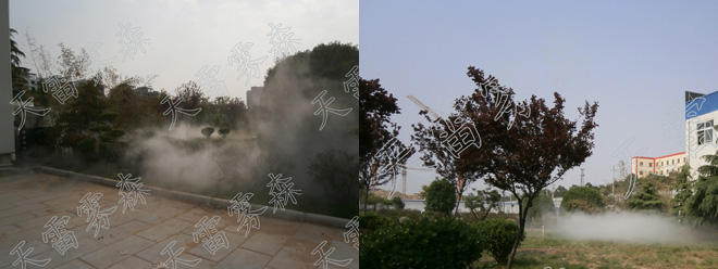 該小區配套的霧森系統是杭州天雷噴泉設備有限公司生產制造安裝的。系統主要組成包括高壓主機組,紅寶石撞針噴頭,高壓管道及其他配件等。高壓主機包括:水處理系統,中央集成控制系統,意大利進口高壓系統,特種隔音系統,7寸液晶觸摸屏,遠程遙控系統,自動保護系統。